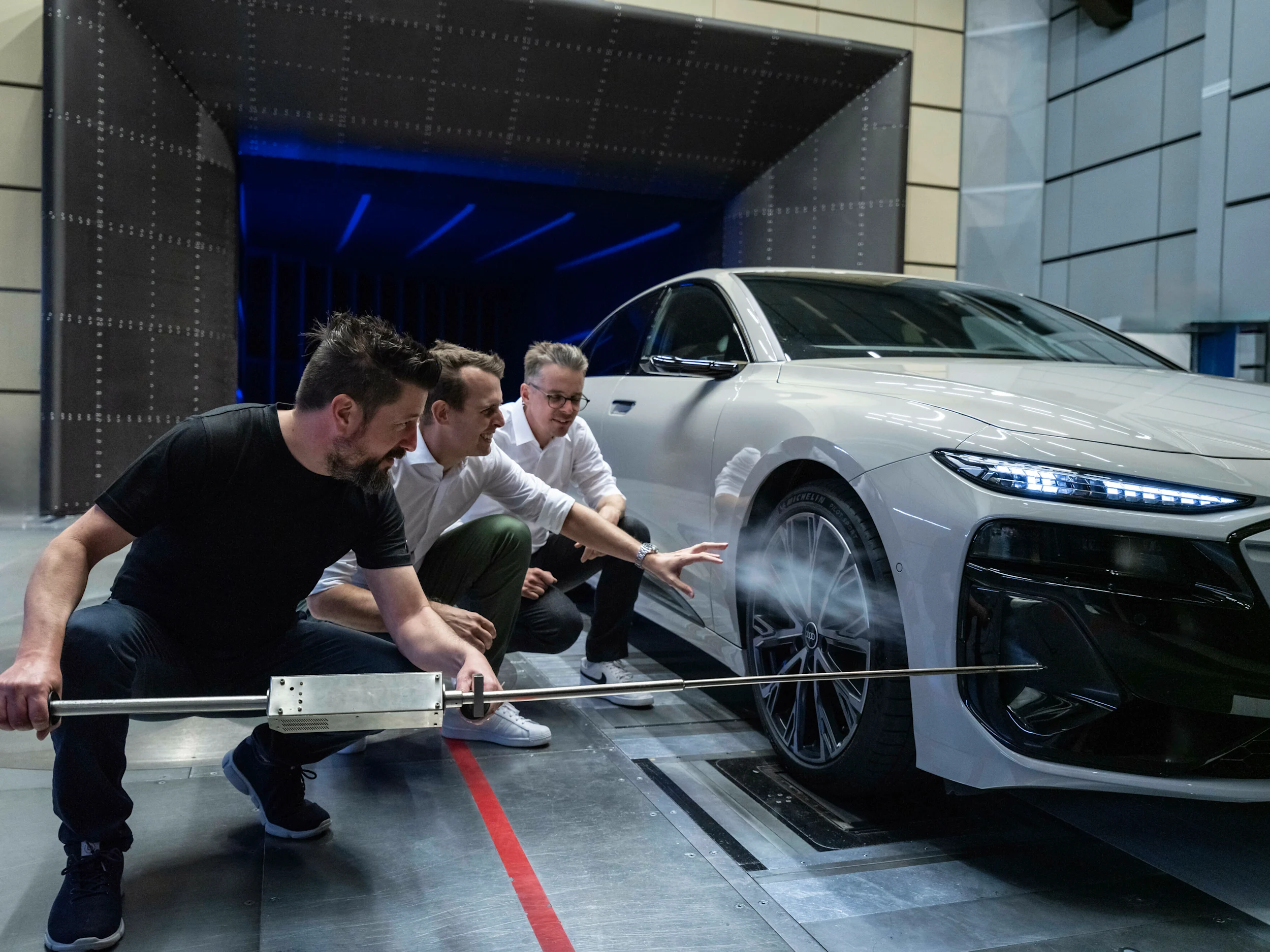Lauterbach lisää: "Toinen esimerkki on taka-akselin raideleveys. Tiimimme olisi toivonut sen olevan kapeampi. Löysimme yhdessä ratkaisun, joka toi parhaat puolet esiin suunnittelun, mittojen ja aerodynamiikan suhteen. Ghelfi: "Aerodynamiikan kannalta aerodynamiikkaa koskevat kehykset olivat erityisen tärkeitä. A6 Avant e-tronin takaosan sivuttaisreunat mahdollistivat selkeästi määritellyn virtauksen pysähtymisen. Ne ovat huomattavasti suurempia kuin muissa Audi-malleissa. Työskentelemme tuulitunnelissa suunnittelukollegojemme kanssa, pohdimme huolellisesti molempien osapuolten väitteitä ja pyrimme löytämään parhaan ratkaisun. Tuloksena on, että pelkät ilmapaneelit parantavat toimintamatkaa 0,008, mikä vastaa kahdeksaa kilometriä. Se on merkittävä etu vain yhdestä suunnittelun yksityiskohdasta."