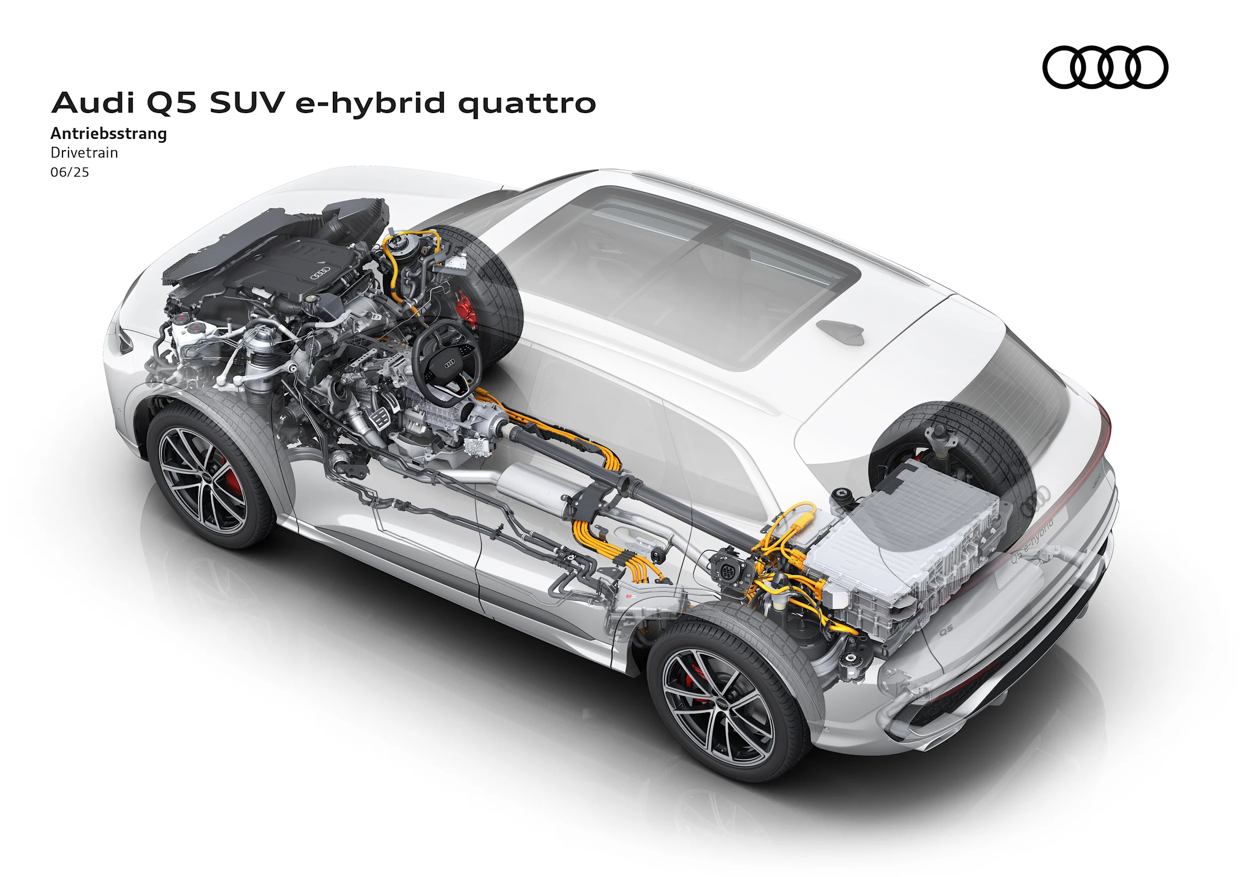 Audi Q5 SUV e-hybrid quattro ja Audi Q5 Sportback e-hybrid quattro -mallien akkukennot on järjestetty kahteen kerrokseen käytettävissä olevan tilan vuoksi ja integroitu auton takaosaan. Jokainen prismamainen kenno varastoi noin 46 prosenttia enemmän energiaa kuin aiemmin C-segmentin korkealattiaisissa autoissa käytetyt kennot. Yksittäisen kennon varauskapasiteetti on 70 ampeerituntia (Ah). 102 kennon raaka-ainekoostumus mahdollistaa suuremman energiatiheyden. Kuusi kennoista koostuvaa pinoa, joissa kussakin on 17 kennoa, muodostavat yhden yksikön ja ne on kytketty sarjoihin.