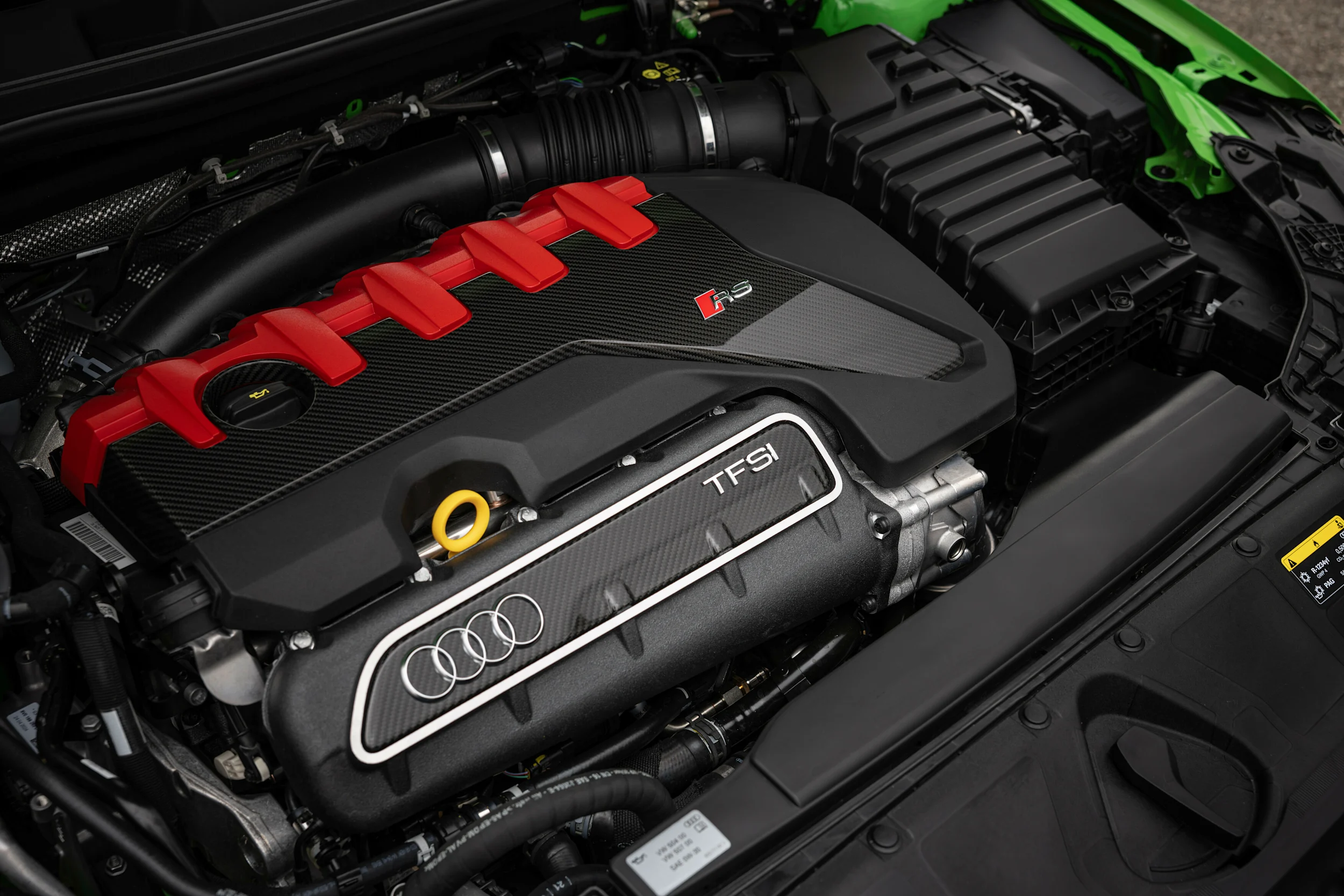 Audi RS 3:n voimanlähteenä toimii legendaarinen 2.5 TFSI -moottori Audi Sportilta, jonka teho on 294 kW (400 hv) ja maksimivääntö 500 Newtonmetriä. Tämä tarkoittaa, että RS 3 kiihtyy 0-100 km/h 3,8 sekunnissa ja voi saavuttaa huippunopeuden 290 km/h. Lukuisat moottoriurheilumenestykset tekevät palkitusta viisisylinterisestä moottorista yhden Audiin vaikuttavimmista ja tekevät RS 3:n ajamisesta vertaansa vailla olevan kokemuksen. Erityisesti tämä johtuu sen ainutlaatuisesta äänestä, joka perustuu tunnusomaiseen 1-2-4-5-3 sytytysjärjestykseen. Vierekkäiset ja ei-vierekkäiset sylinterit sytyttävät vuorotellen tarjoten voimakkaan rytmin ja luonteen, jota täydentää RS-pakoputkisto muuttuvalla läppäohjauksella. Paina punaista moottorin käynnistys-/sammutusnappia, ja viisisylinterisen moottorin syvä ääni kajahtaa – voimakkaammin ja erottuvammin Audi drive select -tiloissa dynamic, RS Performance ja RS Torque Rear. Lisäksi pakoputken läppäohjausta on optimoitu kierroslukualueella 2 200–3 500 kierrosta. Näin viisisylinterinen moottori tuottaa tasaisen ja täyteläisemmän äänen riippumatta valitusta tilasta. Audi Sport parantaa näin tunteellista ajokokemusta A3-perheen huippumallissa – erityisesti Suomen tuontiohjelman mukaisen, vakiovarusteisen RS Sport -pakoputkiston yhteydessä.