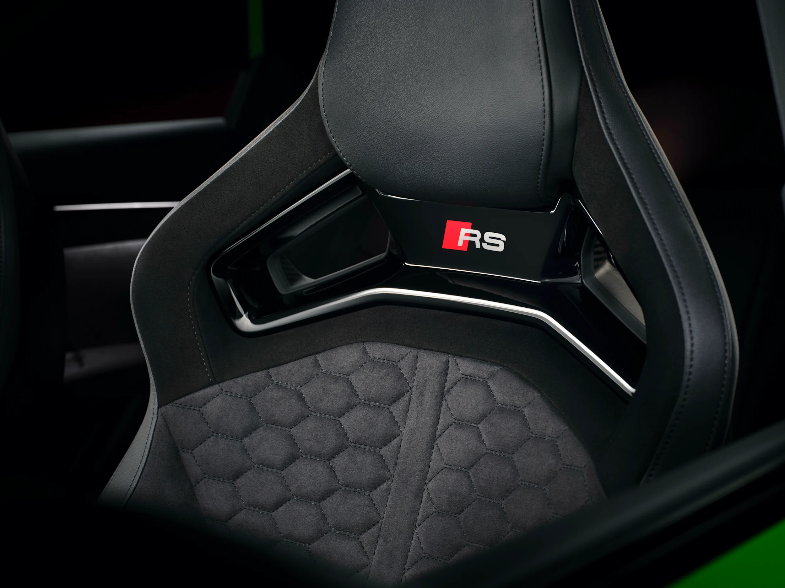 Sisätiloissa, joita hallitsee tummat sävyt, kaikki on suunniteltu suorituskykyä varten: uusi ohjauspyörä, urheiluistuimet tai RS-urheiluistuimet, hiilikuituominaisuudet ja urheilulliset näytöt. Ylä- ja alapuolelta tasainen ohjauspyörä näyttää huomattavasti urheilullisemmalta. Olipa se rei'itettyä nahkaa tai valinnaista Dinamicaa®, jossa on kello 12 -merkki korostusvärillä, se sopii hyvin käteen, kun RS 3:sta ajetaan mutkissa. Samaan aikaan valinnaiset RS-urheiluistuimet tarjoavat vielä paremman tuen. Istuimen keskiosa RS-hunajakennotikkauksella on valmistettu Dinamica®-mikrokuidusta, joka on yhdistetty nappanahkaan sivutukien kohdalla. Pääntuen alla oleva musta kapeneva insertti sisältää suuren RS-merkin ja korostaa RS 3:n urheilullisuutta, kuten myös istuimen selkänojan mattahiilikuituinen takaosa.