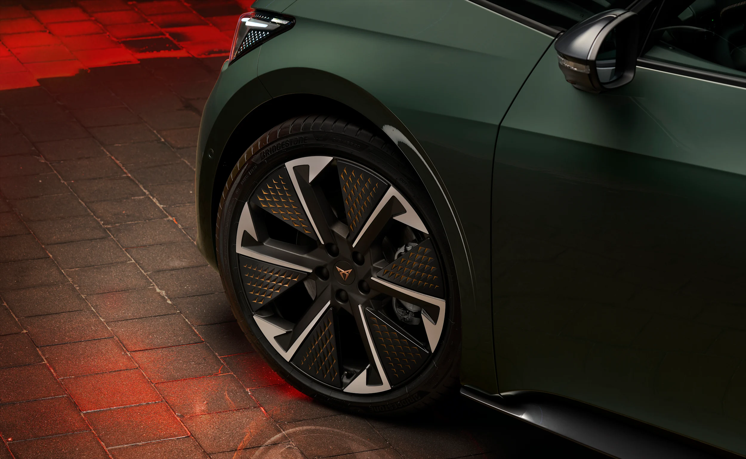 Estetiikka kohtaa suorituskyvyn, kun saataville tulee kaksi uutta 20" kevytmetallivannetta, joiden valmistuksessa käytetään eri tekniikoita, kuten 3D-kuparipuolat tai taottu tekniikka, jotka korostavat auton rohkeaa ja urheilullista henkeä. Leveämmät, huppusuorituskykyiset renkaat auttavat välittämään CUPRA Born VZ:n tehon ja vääntömomentin tielle sen takapyörien kautta. Autossa on myös leveämmät pyörät (8J20’’) nykyisen CUPRA Born -version (7.5J19’ ja 7.5J20’’ sijaan). Viimeisen silauksen täyssähköauton muotoilulle antaa auton tavaratilassa oleva tumma kromi VZ-logo sekä tumman kromin värinen CUPRA-teksti.