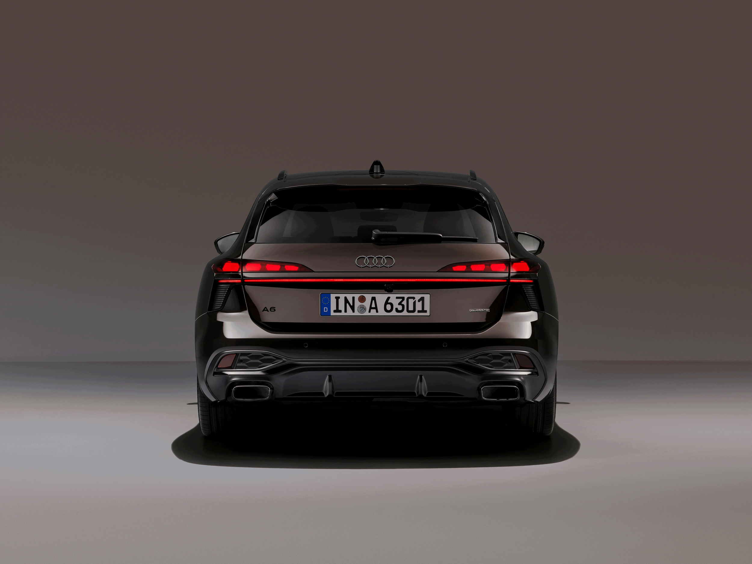 Edessä olevien suurten ilmanottoaukkojen ja ohjattavien viileän ilman ottoaukkojen lisäksi näyttävä kattospoileri ja aerodynaamiset paneelit takasivulasien reunoilla ovat tärkeimmät tekijät tässä aerodynamiikan saavutuksessa. Urheilullinen takaosa, jossa on erottuva diffuusori, ilmentää tyypillisiä Avant-ominaisuuksia. Yhdistettynä voimakkaasti hartialinja-alueelta esiin tuleviin quattro-levennyksiin ja leveään raideväliin, takaosa korostaa mallin dynaamista muotoilua. Samalla sen pitkä akseliväli ja pidennetty konepelti ilmentävät eleganssia ja täydentävät A6 Avantin täydellisiä mittasuhteita.
