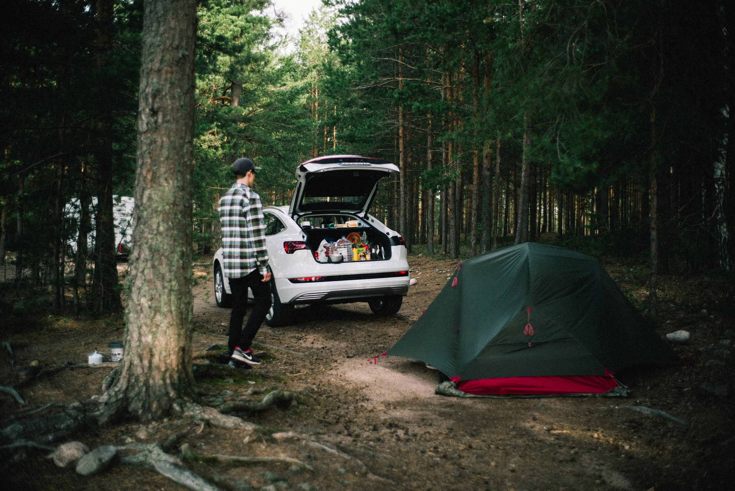 Teltta, rinkka ja latauskaapelit Audi e-tron Sportbackin tavaratilaan ja matkamme kohti Kolin kansallismaisemaa on valmis alkamaan. K-Latauksen laajan latausverkoston myötä pitkienkin matkojen taittaminen on täyssähköautolla vaivatonta.
