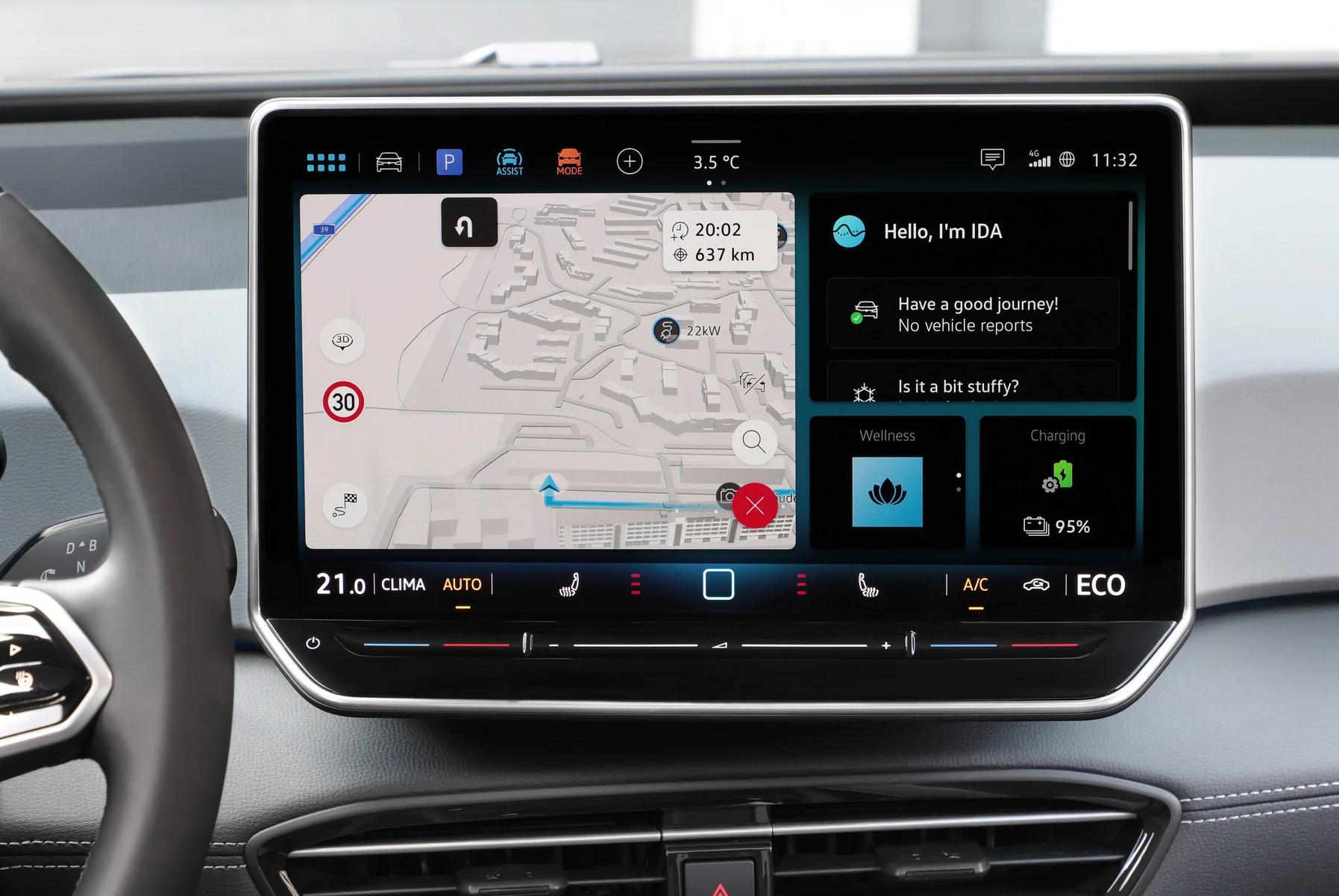 Uusi infotainment-järjestelmä ja ChatGPT. ID.3-mallin ohjaamo on saanut uuden ilmeen. Uusimman sukupolven infotainment-järjestelmässä on suurempi 12,9” kosketusnäyttö ja uusi, intuitiivinen valikkorakenne. Monitoimiohjauspyörää on myös parannettu, mikä mahdollistaa yksinkertaisemman ja intuitiivisemman käytön. Ajosuunnan valitsin on siirretty mittariston reunasta erilliseen viikseen – kuten esimerkiksi ID.7:ssä. Nyt valaistut ja ergonomisesti muotoillut kosketussäätimet sijaitsevat Infotainment-järjestelmän näytön alla ja niitä käytetään säätämään sisälämpötilaa ja äänenvoimakkuutta. Uusi IDA-ääniavusta ei ainoastaan mahdollista useiden auton toimintojen ohjaamista, vaan myös vastaa kysymyksiin käyttämällä online-tietokantoja, kuten Wikipediaa. Toinen uusi ominaisuus on tekoälyn (AI) integrointi ChatGPT:n kautta.