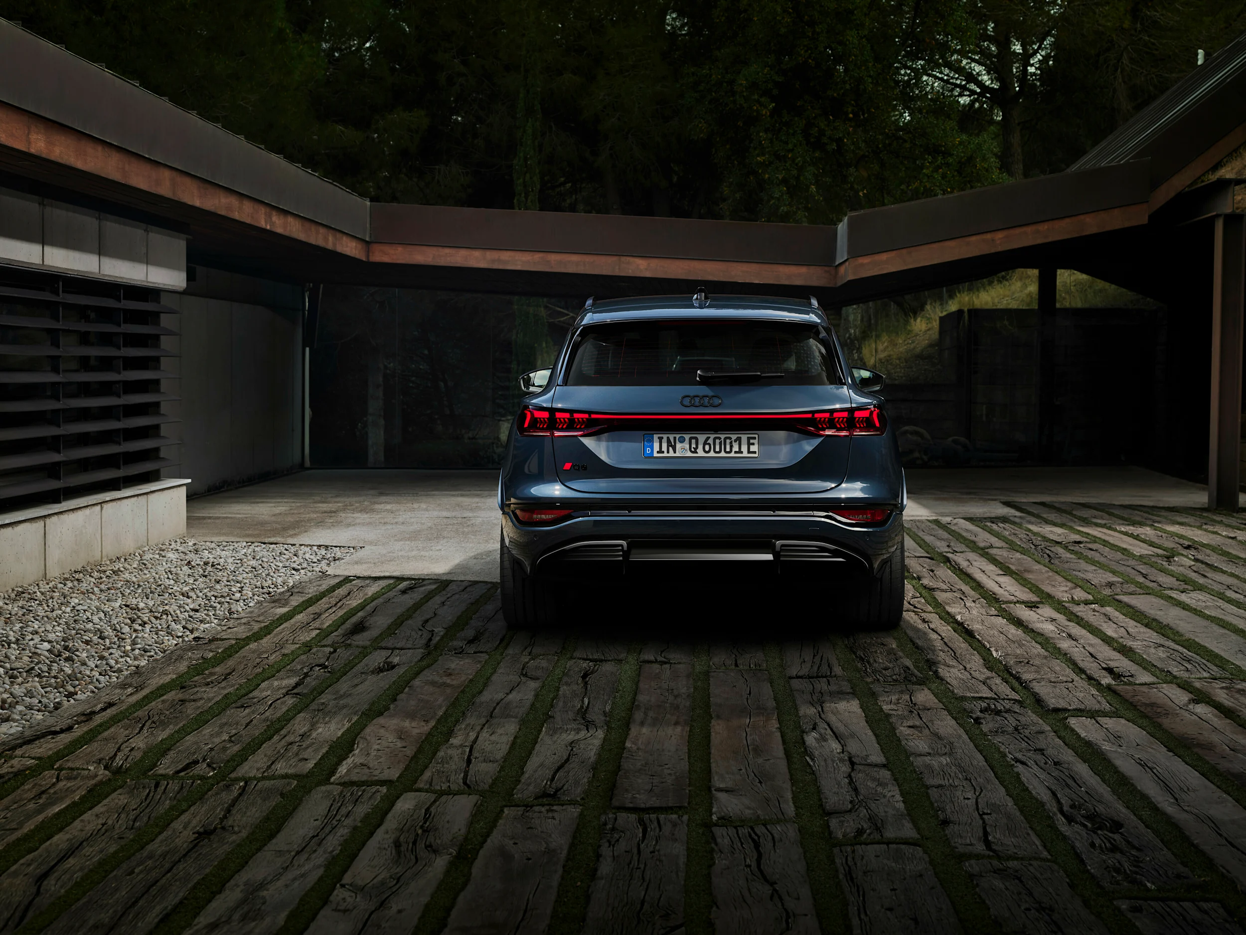 Kattolinja on matala ja se kapenee hieman taaksepäin ja loivat D-pilarit virtaavat tyylikkäästi korirakenteen lihaksikkaisiin hartioihin. D-pilarin ja katon välinen aukko antaa autolle dynaamisemman muodon. Erottuva linja, joka kulkee takavaloista takaoviin, korostaa "quattro-korostusten" yläosaa– korin ääriviivoja, joihin loivasti kaltevat D-pilarit tukeutuvat. Korostukset ovat Audin muotoilu-DNA:n ydin. Audi kutsuu tätä keskeistä suunnitteluperiaatetta "teknologian näkyväksi tekemiseksi". Dynaamisesti muotoiltu takaosa on sekoitu urheilullista eleganssia ja maskuliinista voimaa. Selkeä ja leveä taka-arkkitehtuuri yhtenäisellä valonauhalla antaa Q6 e-tron quattrolle Audille tyypillistä selkeyttä.