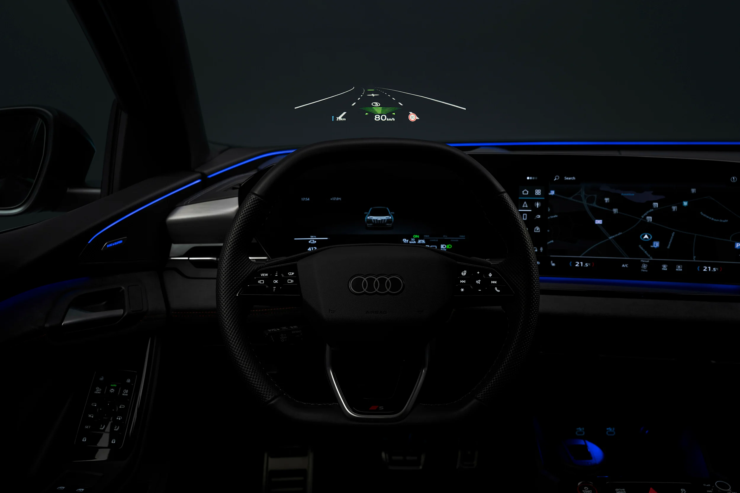 Lisävarusteena saatavalla Augmented Reality Head-Up Display -näytöllä, joka on toinen digitaalisen näyttämön keskeinen elementti, Audi ottaa suuren askeleen eteenpäin näyttötekniikassa. Se heijastaa suurta kallistettua kuvatasoa tuulilasin poikki kuljettajaa kohti ja näyttää keskeisimpiä tietoja, kuten nopeus-, liikennemerkit, apu- ja navigointisymbolit. Kuvataso on kallistettu eteenpäin lisätyn todellisuuden vaikutelman parantamiseksi. Ihmissilmän fokus liikkuu sen mukana. Tämä prosessi ja kuvan virtuaalinen etäisyys luovat vaikutelman, että näytetyt elementit kelluvat jopa 200 metrin päässä. Virtuaalinen sisältö integroituu siis saumattomasti todellisuuteen. Lisätyn todellisuuden näkökenttä vastaa noin 88 tuuman diagonaalia kuljettajan paikalta katsottuna.