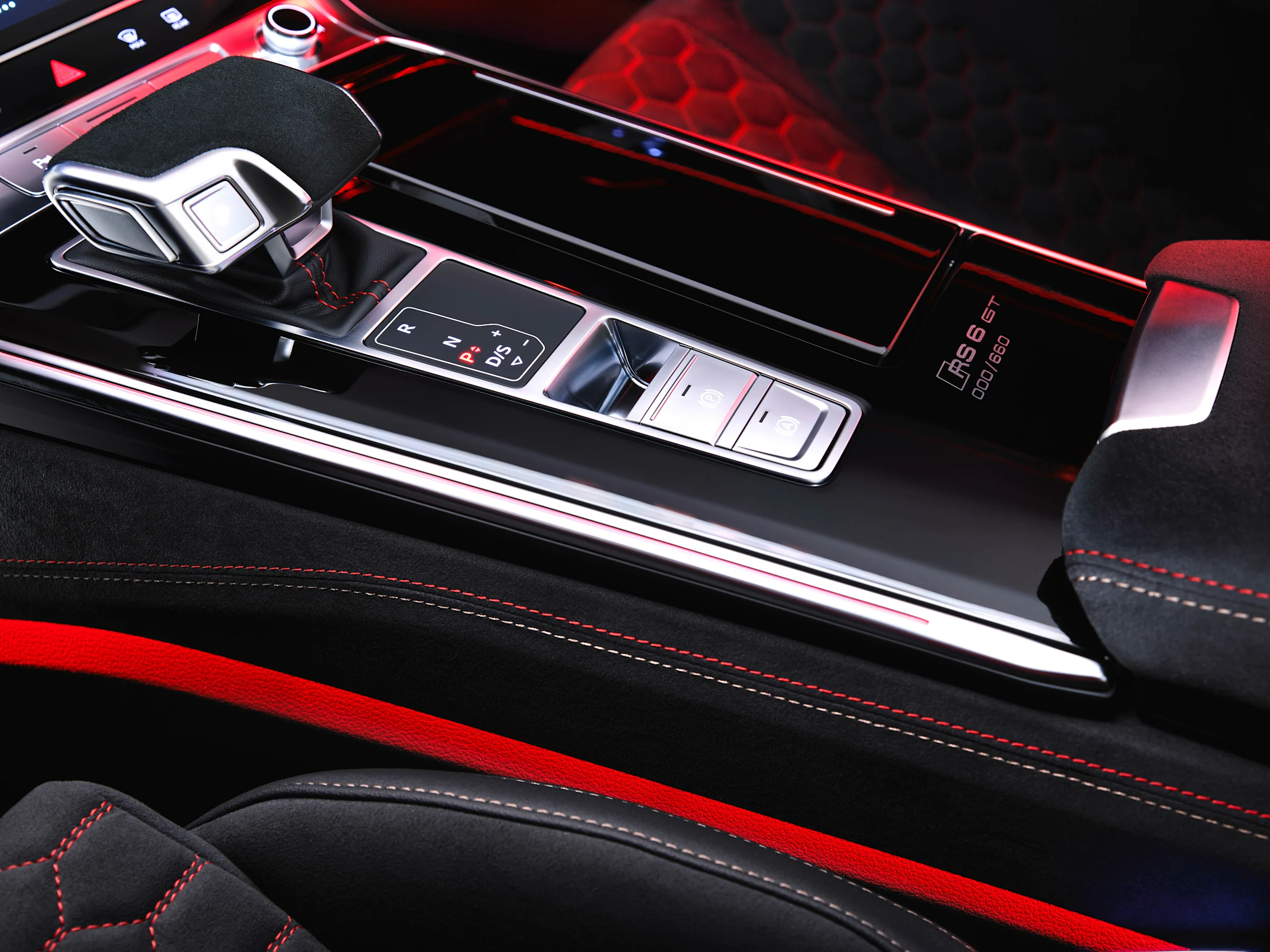 RS 6 Avant GT rullaa tuotantolinjalta vakiona RS design paketti plus -varustelulla. Mustaa sisätilaa korostavat lukuisat korostukset ainutlaatuisessa punaisen ja kuparin väriyhdistelmässä, kuten ohjauspyörän tikkaukset, keskikonsolin sivut, keskikyynärnoja ja ovien käsinojat sekä lattiamatot "RS 6 GT" tekstillä. Uudet RS-erikoisurheiluistuimet nahka-Dinamica mikrokuitu-yhdistelmällä ja "RS 6 GT" -teksti aivan pääntukien alapuolella ovat myös tätä värimaailmaa. Istuimen keskiosan hunajakenno-ompeleet hohtavat Express-punaisen sävyssä, kun taas istuimen ulkosaumassa on kupariviimeistely.