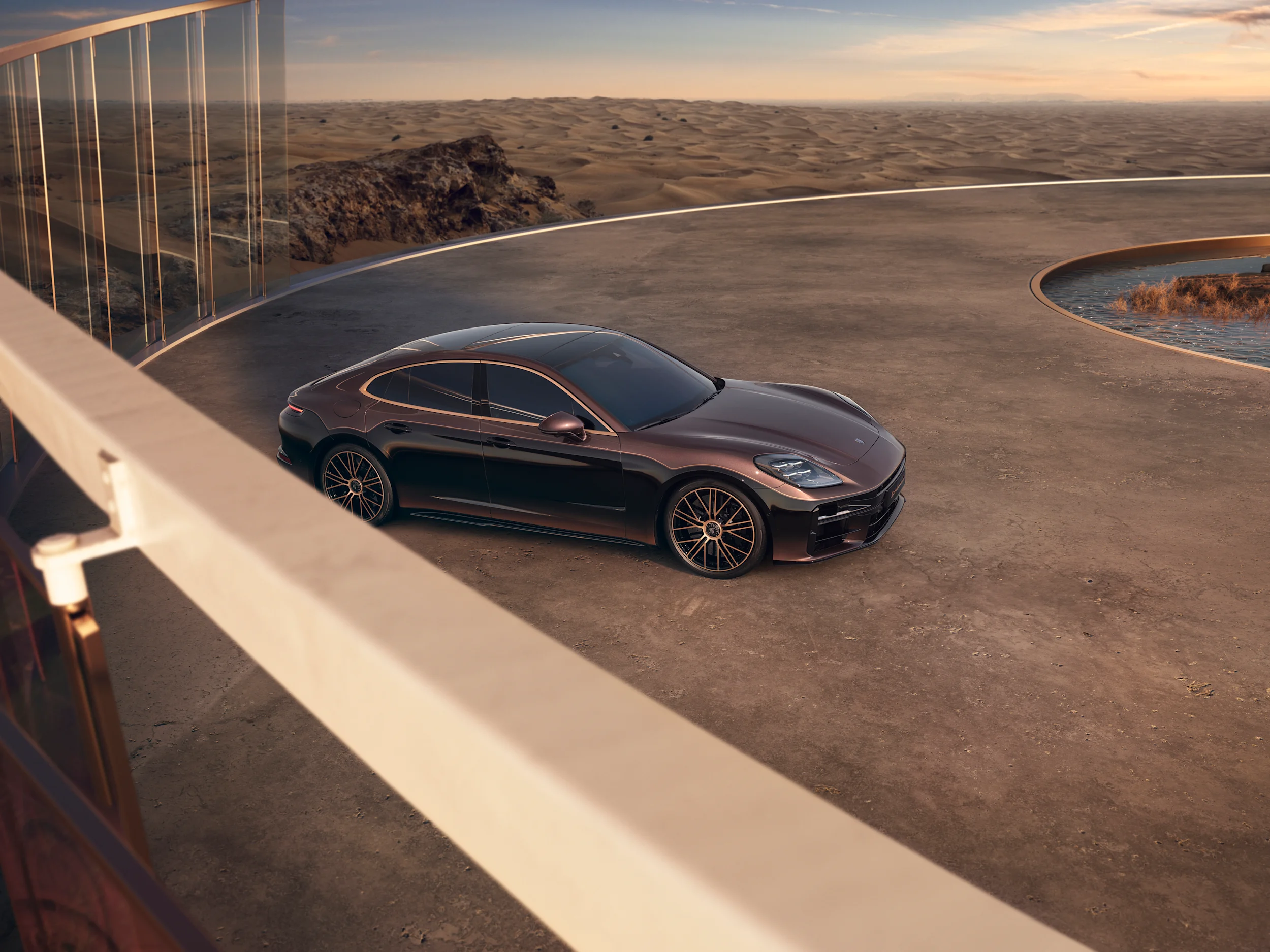 Porsche Exclusive Manufaktur on maalannut inspiraatiomallin kaksisävyiseksi, joka perustuu autoon erityisesti luotuun värisävyyn: Leblon Violet Metallic. Tässä violetissa värisävyssä on aavistus kastanjaa. Style Porsche- ja Exclusive Manufaktur -yksiköiden asiantuntijat hyödyntävät monimutkaista tuotantotekniikkaa, jossa silmiinpistävä väri haalistuu tasaiseksi mustaksi auton alemmassa kolmanneksessa. Oven kynnykset sekä etu- ja takaspoilerin reunat ovat mustat. Sävytetyt ajovalot, takavalot ja ikkunat toistavat teemaa ja pakoputket ovat Bronziten väriset. Sonderwunsch Panamera Turbon kirkas lakka sisältää aidolla kullalla höyrystettyjä hiutaleita, jotka luovat ensiluokkaisen ilmeen syvyydellään. Ulkopuolella auton sivulla kulkee raita: väri on uudelleen kehitetty Avium Metallic, ja siihen on myös integroitu Sonderwunsch-logo. Myös 21 tuuman vanteiden pinta ja sivuikkunoiden kehykset on viimeistelty Avium Metallic -värillä. Käsityötaito ja yksityiskohtiin keskittyminen näkyvät huolellisesti viimeistellyissä logoissa auton takaosassa.