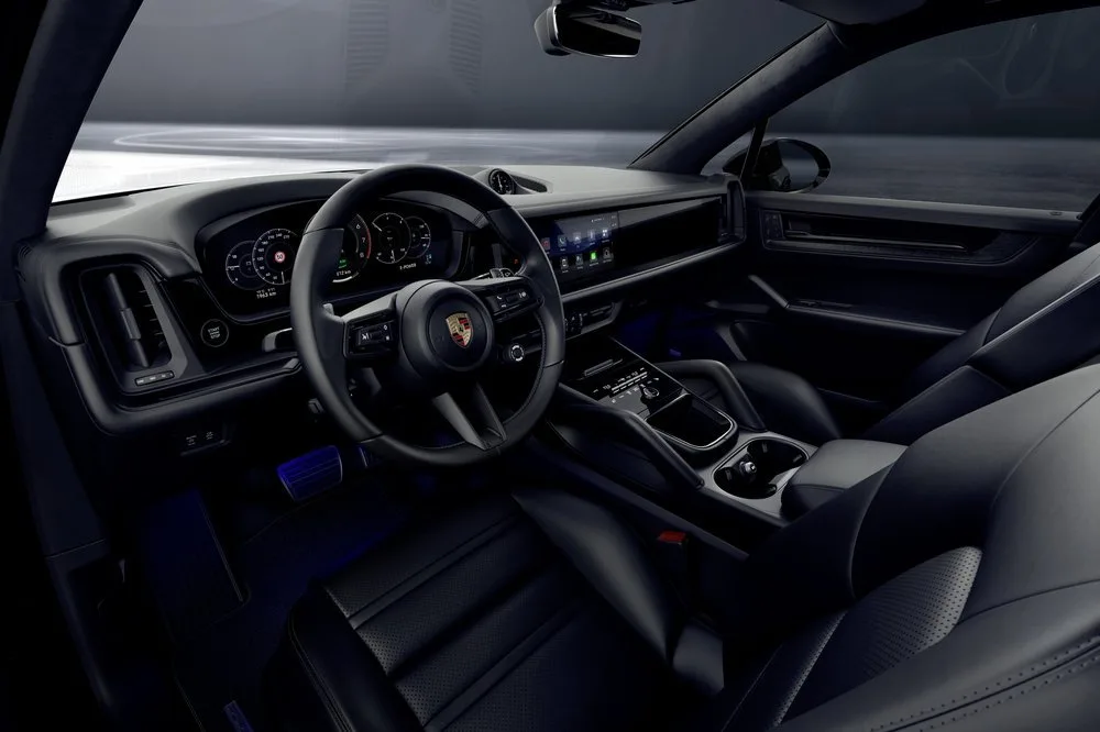 Cayenne-malleissa Sport Design -paketti, ulkopaketti, peilikotelot, Porsche-logo ja takana oleva mallimerkintä ovat kaikki kiiltävän mustia. Sisustaa täydentää harjattu musta-alumiini -sisätilapaketti.