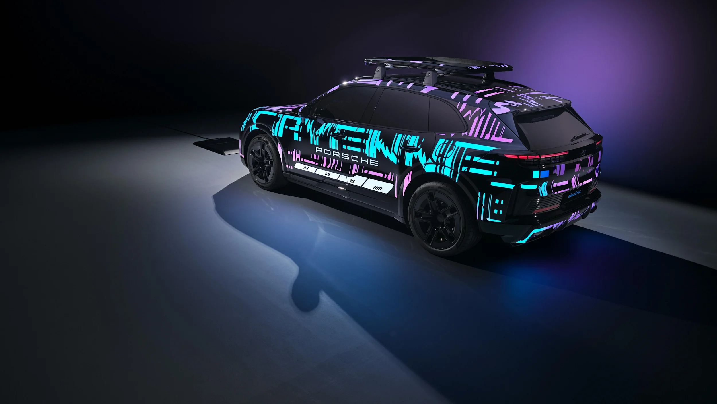 Ensiesiintymisissään Isossa-Britanniassa sähköinen Cayenne herätti huomiota silmiinpistävällä teippauksellaan. IAA-prototyyppiauto Münchenissä on nyt varustettu samankaltaisella innovatiivisella fluoresoivalla maalilla. Kun sähkö virtaa, kirkasvärinen kuvio muodostuu auton pinnalle: Style Porsche on suunnitellut dynaamisen naamiointikuvion, jossa tietyt maalialueet jätetään tarkoituksella tummiksi. Viittä värisävyä, sinisestä violettiin, voidaan ohjata tarkasti.