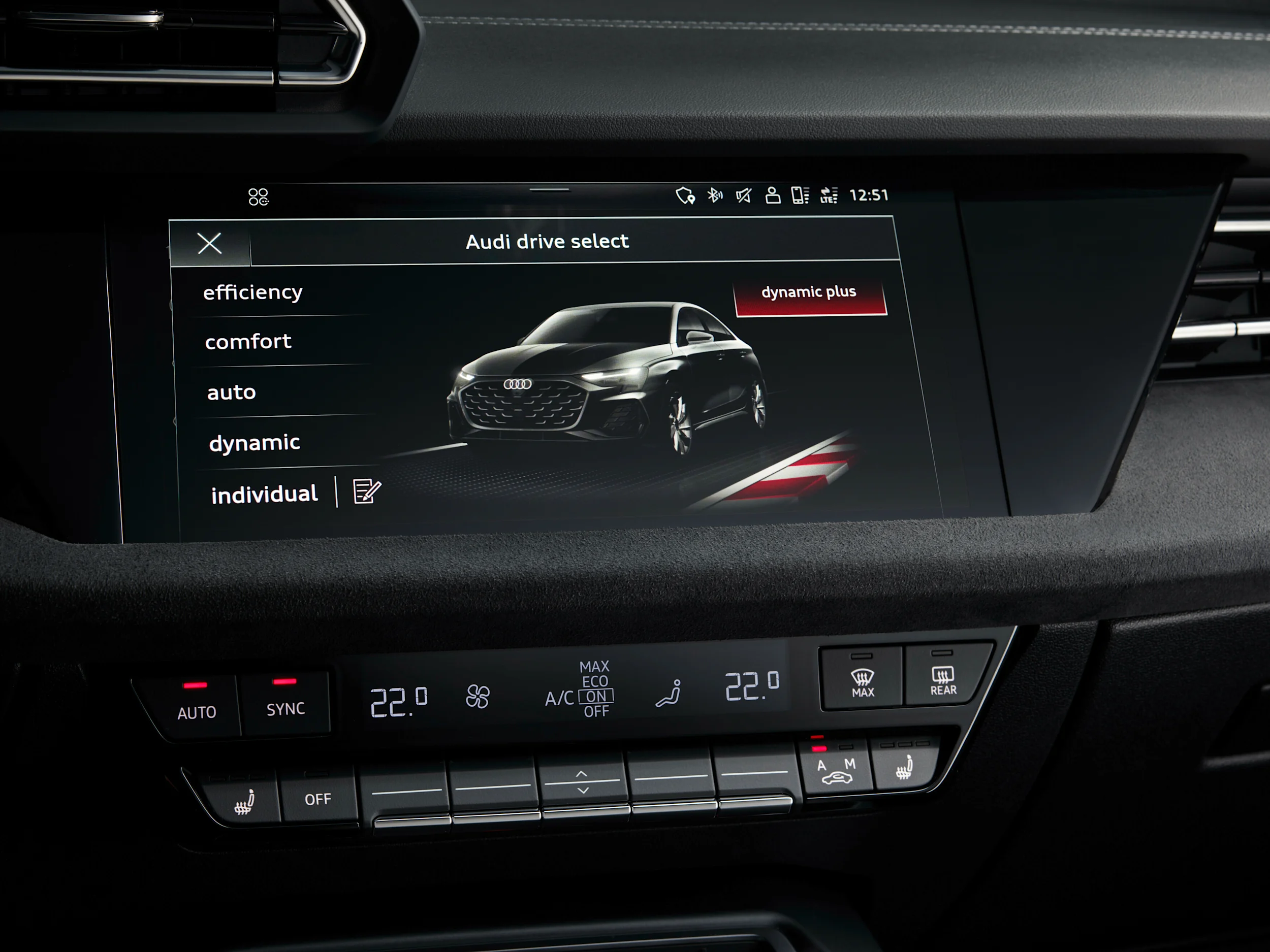 Audi drive select tarjoaa kuusi erilaista ajoprofiilia – mukavuuden korostamisesta erittäin dynaamiseen. Audi S3:n mallipäivityksessä on tuttujen profiilien (auto, comfort, dynamic, individual ja efficiency) lisäksi uusi dynamic plus -tila, joka nimensä mukaisesti takaa erityisen korkean ajodynamiikan. Tätä varten Torque splitter -momentinjakaja siirtää mahdollisimman paljon vääntömomenttia taka-akselille ja kaarteen ulkopuoliselle takapyörälle, mikä parantaa auton ketterää käsittelyä. Elektroninen ajonvakautusjärjestelmä (ESC) siirtyy tässä ajotilassa automaattisesti Sport-tilaan. ESC-järjestelmä on tällöin sallivampi yliohjaamiselle, joka takaa entistä urheilullisemman ajotuntuman erilaisilla tien pinnoilla. Moottori ja vaihteisto on viritetty myös dynamic plus -tilaa varten. Normaaliin dynamic-ajotilaan verrattuna 2.0 TFSI:n tyhjäkäyntinopeus on kasvanut 200 rpm - 1 300 rpm, mikä parantaa liikkeellelähtöjä paikaltaan entisestään. Kaasuvaste on vielä välittömämpi. Nopeampien vaihteidenvaihdon lisäksi vaihteisto lisää myös dynamiikkaa myöhemmillä ylösvaihdoilla ja aikaisemmilla alasvaihdoilla.