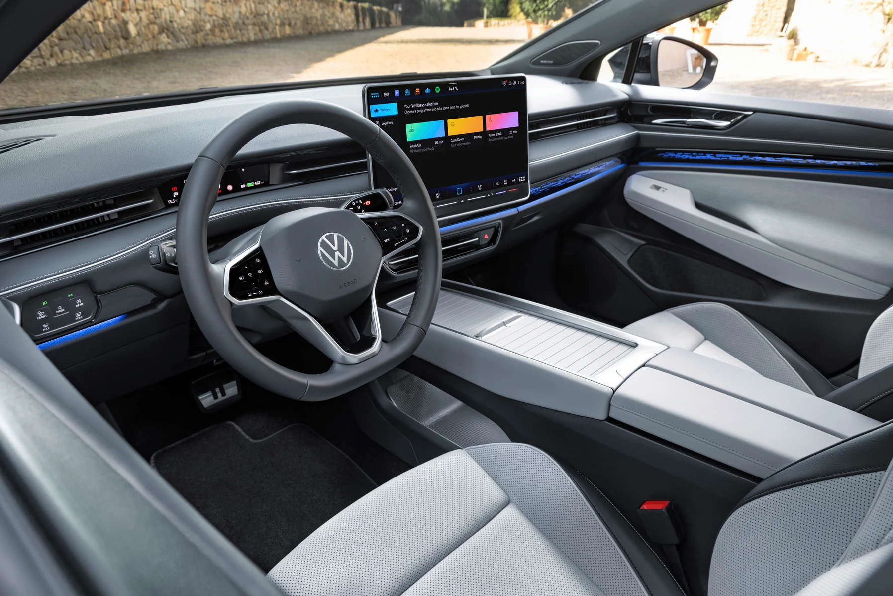Uusi Wellness In-Car -sovellus. Uusi ID.7 Tourer edustaa huippuluokan mukavuutta. Tämä on mahdollista erilaisilla yksityiskohdilla, kuten ohjaamon ilmastoinnin suuttimien älykäs sähköinen ohjaus ja ergoActive-istuimet, joissa on uusi painepistehierontatoiminto ja automaattinen ilmastointi. Toinen innovaatio on panoraamakattoikkuna älylasilla – tässä lasikerrokset voidaan vaihtaa elektronisesti joko läpinäkymättömiksi tai kirkkaiksi. Wellness In-Car -sovellus on myös täysin uusi. Tämä mahdollistaa auton eri toimintojen säätämisen kolmen esikonfiguroidun ohjelman avulla (Fresh Up, Calm Down ja Power Break), jotka voivat auttaa parantamaan hyvinvointia matkan tai taukojen aikana. Auton varusteista riippuen sovellus käyttää taustavaloa, ääntä, ilmastointia, älylasitoimintoa, istuinilmastointia ja istuinten hierontaa sekä ID.LIGHT-valoa ja infotainment-näyttöä.