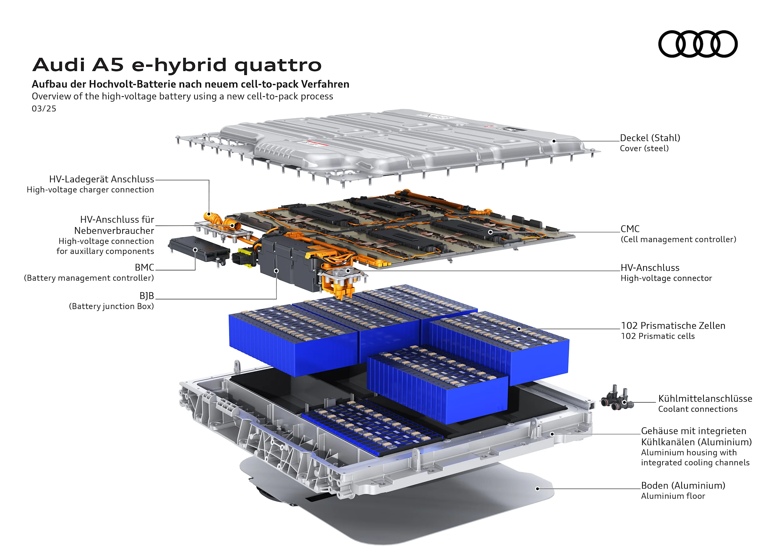 Akkukennostojen järjestelyn osalta Audi noudattaa uutta lähestymistapaa: cell-to-pack. Tässä prosessissa kennoja eivät enää sijoiteta akkumoduuliin, vaan ne liimataan suoraan akkuun. Tuloksena saatava korkeampi pakkaustiheys tarkoittaa, että HV-järjestelmän energiakapasiteettia ja energiatiheyttä voidaan lisätä samalla kun tilantarve vähenee. Kennokemian teknisten kehitysten ansiosta käytettävissä on korkeampi sähköteho verrattuna edelliseen sukupolveen, jopa alhaisella lataustasolla ja alhaisissa ulkolämpötiloissa.