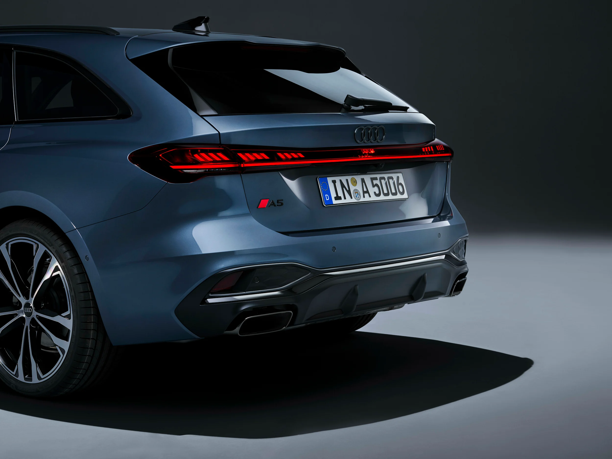 Näyttävässä, erottuvassa takaosassa yhdistyvät urheilullinen, tunteisiin vetoava muotoilu ja älykäs tekniikka. Veistoksellisen geometrian ja jatkuvan, kolmiulotteisesti näkyvän valonauhan yhdistelmä antaa uuden Audi A5:n takaosalle ilmettä ja visuaalista dynaamisuutta. Perusmallien takanäkymän lisäkohokohtia ovat puskurin selkeä, moderni muotoilu tummalla diffuusorilla ja korkealaatuiset suorakaiteen muotoiset pakoputket.