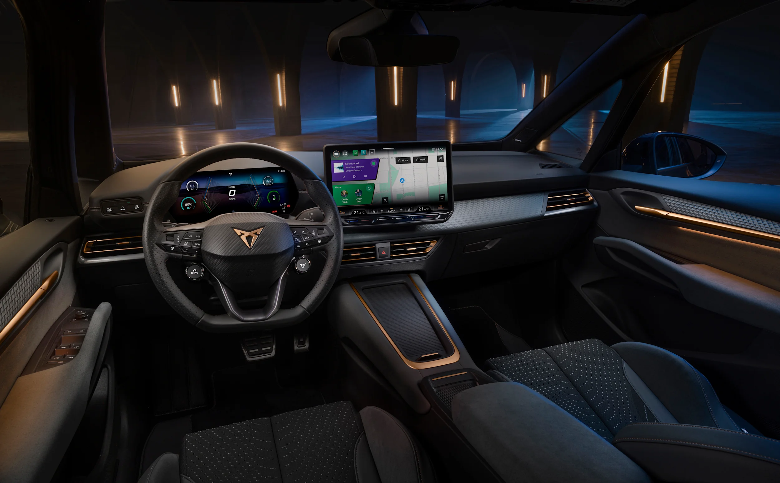 Kun kuljettaja ja etumatkustaja istuvat vakiona oleville urheilullisille istuimille (tai VZ‑version CUPBucket‑istuimille), CUPRA Bornin muotoilufilosofia hahmottuu välittömästi. Ilmeikkäät sisälinjat, rohkeat pintojen siirtymät ja vahva luonne määrittävät ohjaamoa, ja veistoksellinen kojelauta kaartuu kuljettajaa kohti säilyttäen mallin kuljettajakeskeisen luonteen.