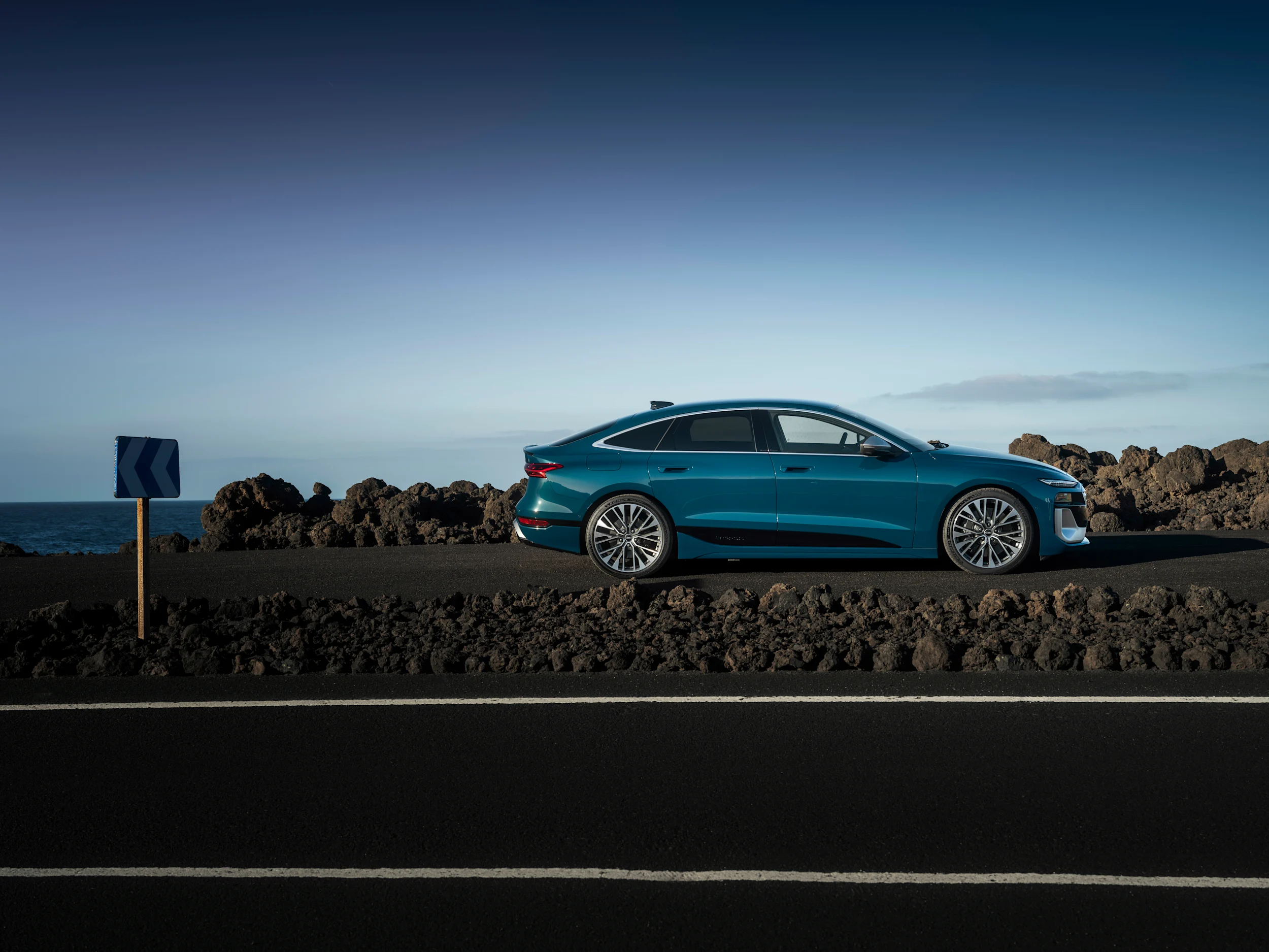 Audi A6 e-tronin dynaaminen kattolinja lepää vahvalla alustalla ja matalalla ajokorkeudella. Quattro-levennykset ovat niitä muotoja, jotka korostavat quattro-voimalinjaa veistoksellisella ja jäntevällä muodollaan. Ne ovat keskeinen elementti Audin muotoilun DNA:ssa. Auton sydämenä sykkivä akku on korostettu mustalla sisäosan kynnysalueella. Sivulta katsottuna pokkaukset antavat autolle matalan, solakan ja dynaamisen ulkonäön. Ne ulottuvat auton taakse saakka ja niihin integroidut heijastimet antavat A6 e-tronille visuaalisesti venyneen ulkonäön. Avantille on ominaista myös erittäin tasainen kattolinja, jossa D-pilari kallistuu jyrkästi eteenpäin. Alumiinin näköinen reunus, kattospoilerista A-pilariin on A6 Avant e-tronin uusi erottuva ominaisuus, joka luo erinomaisen tunnistettavuuden.