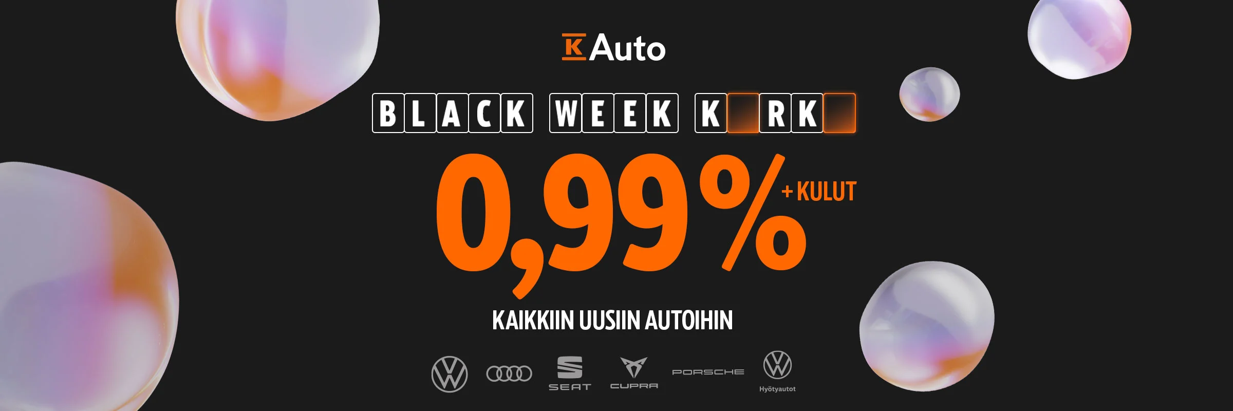 Osta, vaihda tai huollata autosi Black Week -hinnoin. Uudet autot 0,99 % korolla, valikoiduista vaihtoautoista Plussa-piste joka eurosta ja paljon muuta! Voimassa vain 30.11.2025 asti.