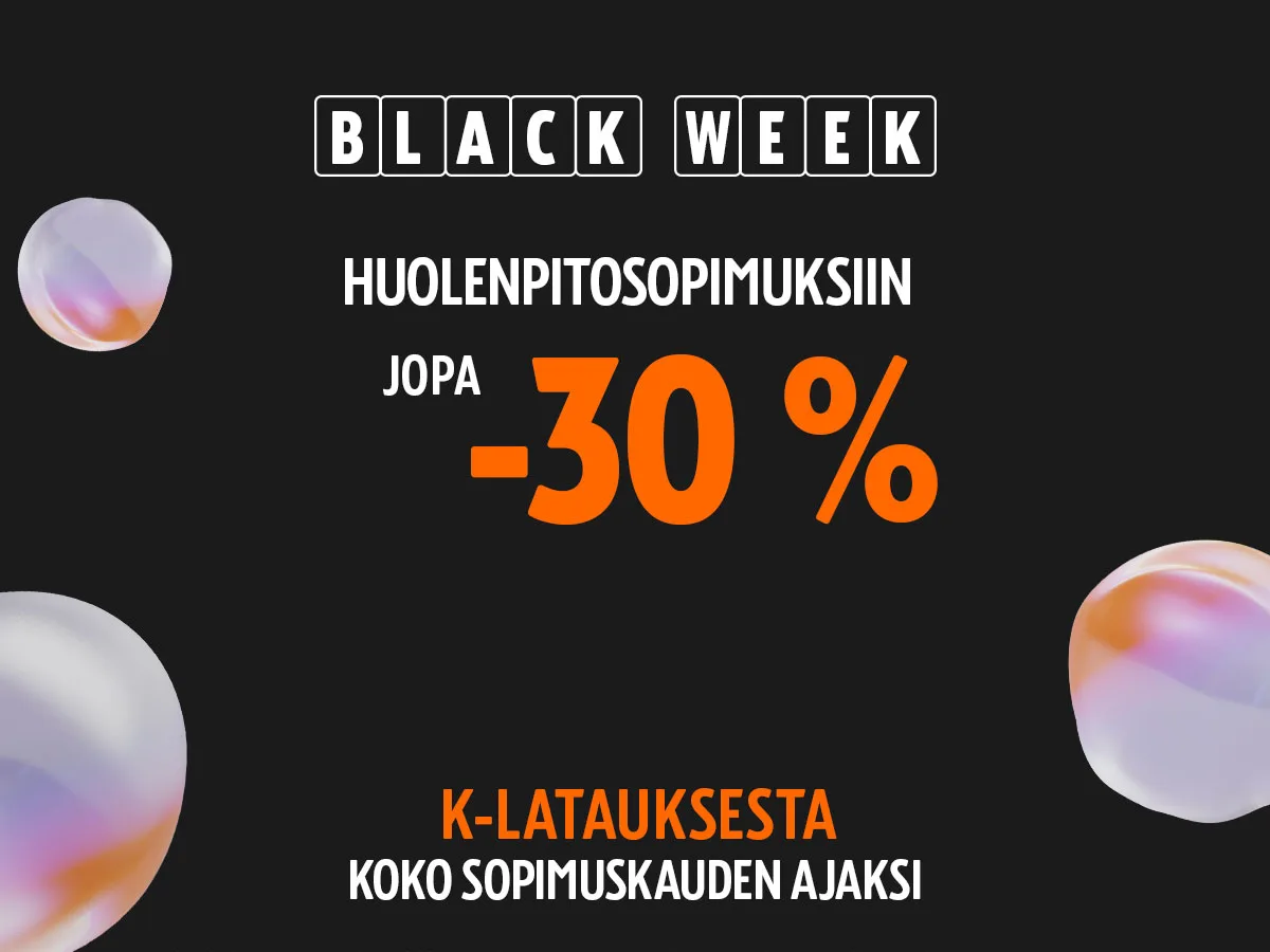 Latausetu huolto- ja huolenpitosopimuksiin: Black Weekin aikana 23.11.–30.11.2025 huolto- tai huolenpitosopimuksen ostajalle myönnetään latausetu koko sopimuskauden ajaksi. 36 kk sopimukselle –20 % ja 48 kk sopimukselle –30 % K-Latauksesta. Etu koskee yksityisasiakkaita, jotka ostavat Volkswagen, Volkswagen Hyötyautot, Audi, SEAT tai CUPRA merkkiseen autoon huolto- tai huolenpitosopimuksen kampanja-aikana. Etu on henkilökohtainen eikä sitä voi siirtää toiselle henkilölle. Latausetu toteutetaan K-Latauksen kautta ja se on voimassa vain K-Latauksen omilla latauspisteillä. Etu on kiinteä osa sopimusta ja voimassa vain alkuperäisen sopimuskauden ajan. Etu ei jatku mahdolliselle jatkosopimuskaudelle tai jos sopimus päätetään kesken kauden. Etu koskee myös uusia autoja sekä alle 2 vuotta vanhoja käytettyjä autoja sopimusta tehtäessä. Etu on saatavilla myös, jos asiakas tilaa uuden auton Black Weekin aikana ja auto luovutetaan tammikuun 2026 loppuun mennessä. Sopimus ja latausetu koskee vain sopimuksella eriteltyä ajoneuvoa. Etukoodi ja ohjeet aktivoinnille toimitetaan viimeistään viikon kuluessa sopimuksen tekemisestä.
