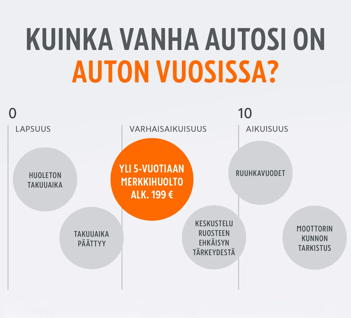 Auton elinkaarta havainnollistavasta kuvasta näkee, miten auton tarpeet muuttuvat iän myötä askel askeleelta.