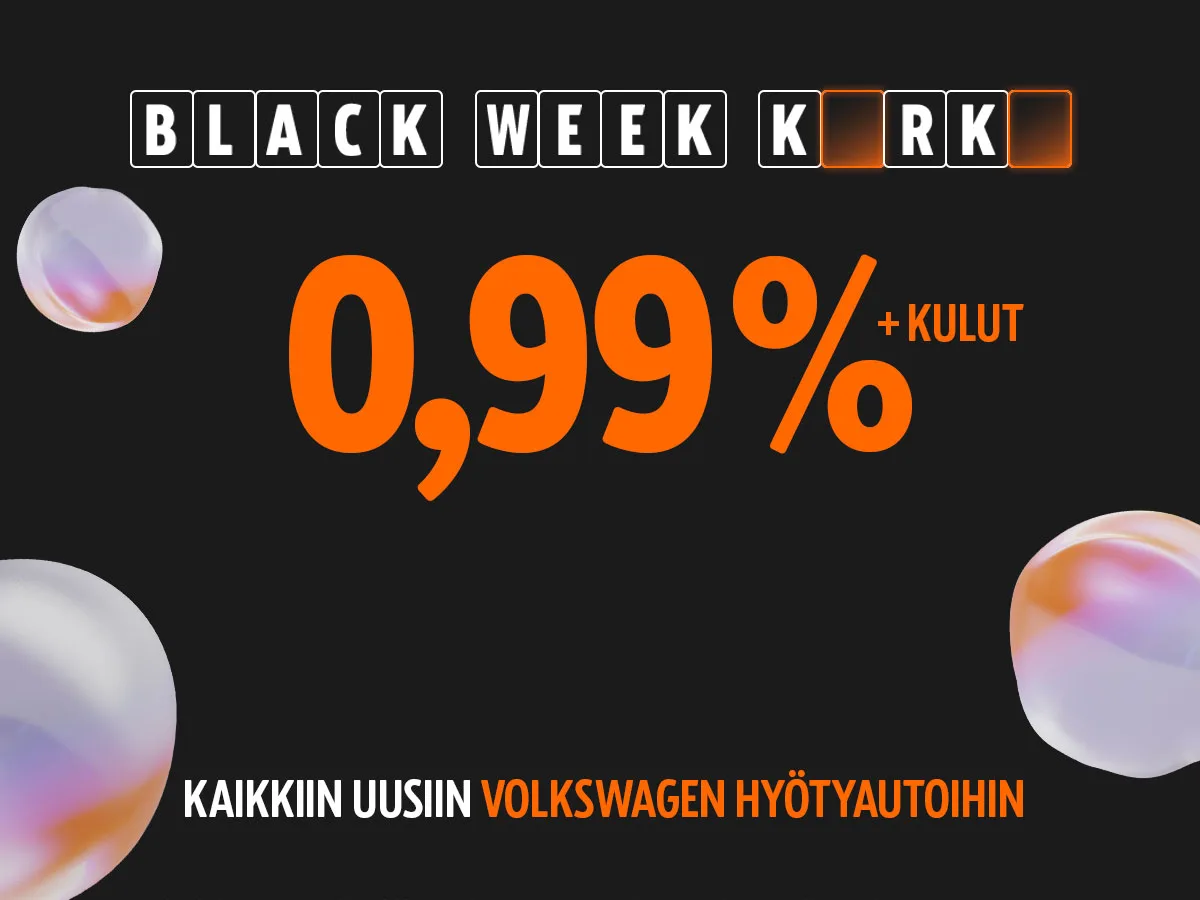 Kaikki uudet Volkswagen Hyötyautot nyt korolla 0,99 % + kulut! Lisäksi valikoiduista Volkswagen Hyötyautojen vaihtoautoista kertyy Plussa-piste jokaisesta eurosta. Black Weekin valikoimasta löydät pakettiautoja, kevytkuorma-autoja ja muita Volkswagenin työ- ja arkipäivän luottoautoja sekä nopeaan toimitukseen että yksilöllisesti tilattavaksi. Tutustu mallistoon ja löydä sinulle sopiva Volkswagen Hyötyauto Black Week -edulla.