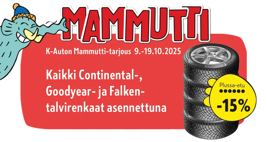 Talvirenkaita asennettuna -15 % ja K-Lataukset -20 % Plussa-kortilla. Tallatut hinnat K-Auton mammuttimarkkinoilla vain 19.10.2025 asti.